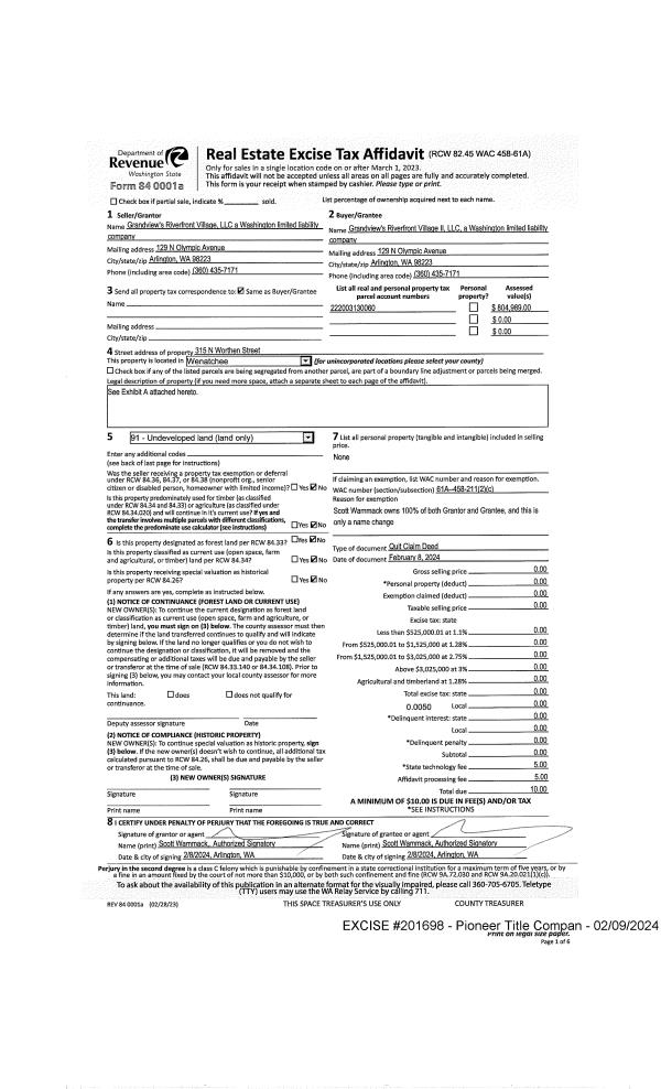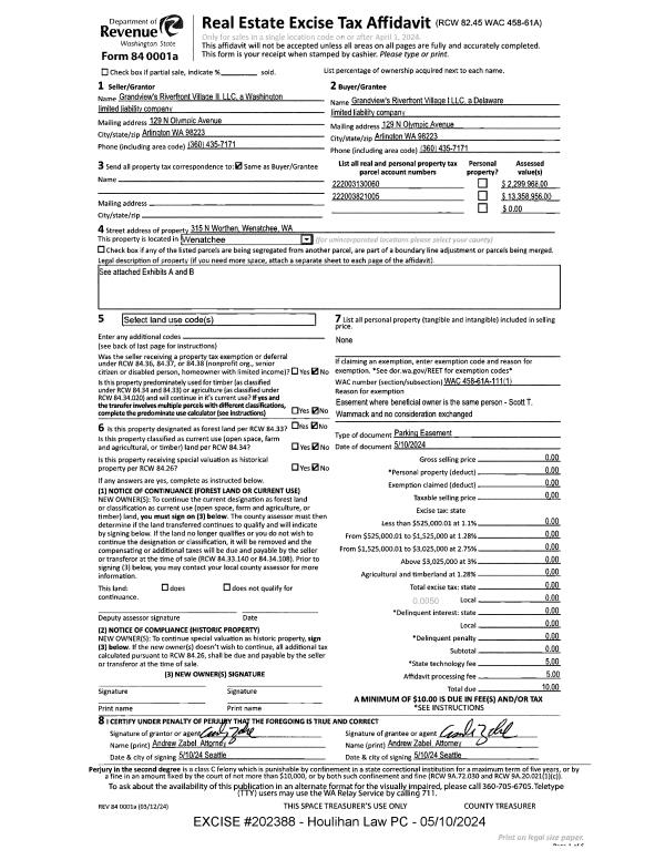 | 4 | 02/01/2021 | SWD | Statutory Warranty Deed | LINEAGE WA WENATCHEE RE LLC | RIVERFRONT VILLAGE PHASE 1 LLC | | | $2,750,000.00 | 190353 | 2535726 |