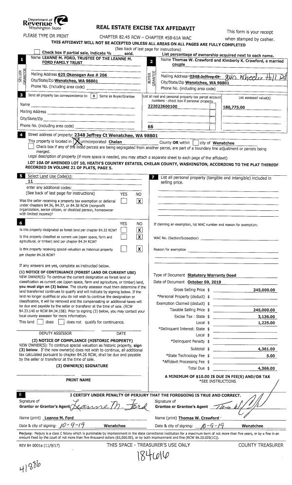 | 1 | 12/30/2019 | SWD | Statutory Warranty Deed | LINEAGE WA WENATCHEE RE LLC | PORT OF CHELAN COUNTY | | | $4,500,000.00 | 185460 | 2508622 |