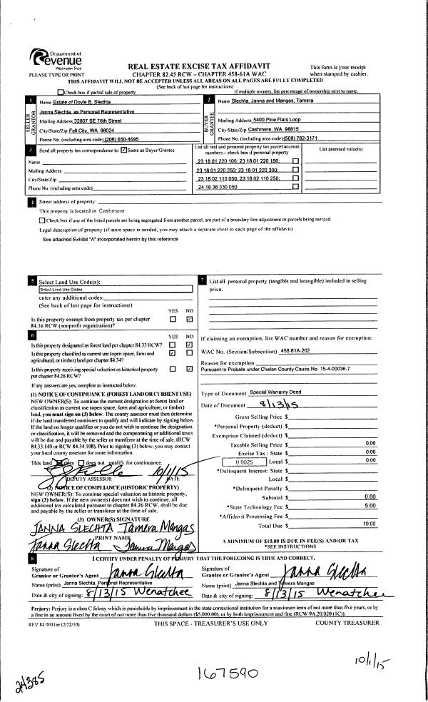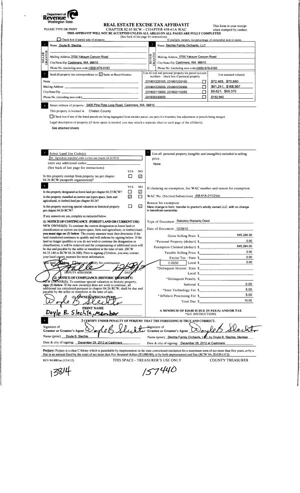 | 4 | 12/28/2012 | WD | Warranty Deed | JANNA SLECHTA & TAMERA MANGAS | SLECHTA FAMILY ORCHARDS LLC | | | | 157440 | 2374303 |