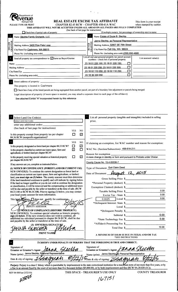 | 6 | 08/25/2015 | Q | Quit Claim Deed | SLECHTA FAMILY ORCHARDS LLC | SLECHTA DOYLE B ESTATE | | | $0.00 | 167151 | 2424118 |