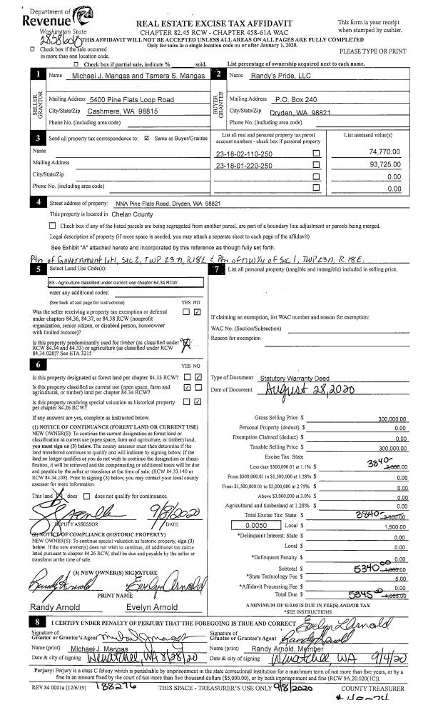 | 3 | 09/08/2020 | SWD | Statutory Warranty Deed | MANGAS MICHAEL J & TAMARA S | RANDYS PRIDE LLC | | | $300,000.00 | 188276 | 2524162 |