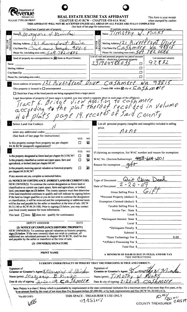 1 | 02/20/2009 | Q | Quit Claim Deed | MINKS MARJORIE I | MINKS TIMOTHY W | | | $0.00 | 145107 | 2297735 |