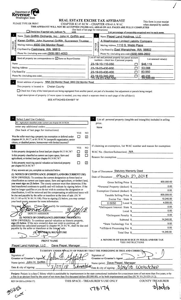| 1 | 03/30/2018 | SWD | Statutory Warranty Deed | GRIFFITH JOHN H & KAREN | PIEPEL LAND HOLDINGS LLC | | | $800,000.00 | 178174 | 2475274 |