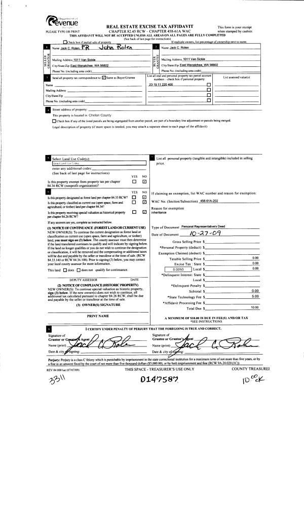 | 5 | 12/02/2009 | PR | Personal Representatives Deed | ROLEN JOHN M | ROLEN JACK C | | | $0.00 | 147587 | 2315387 |
