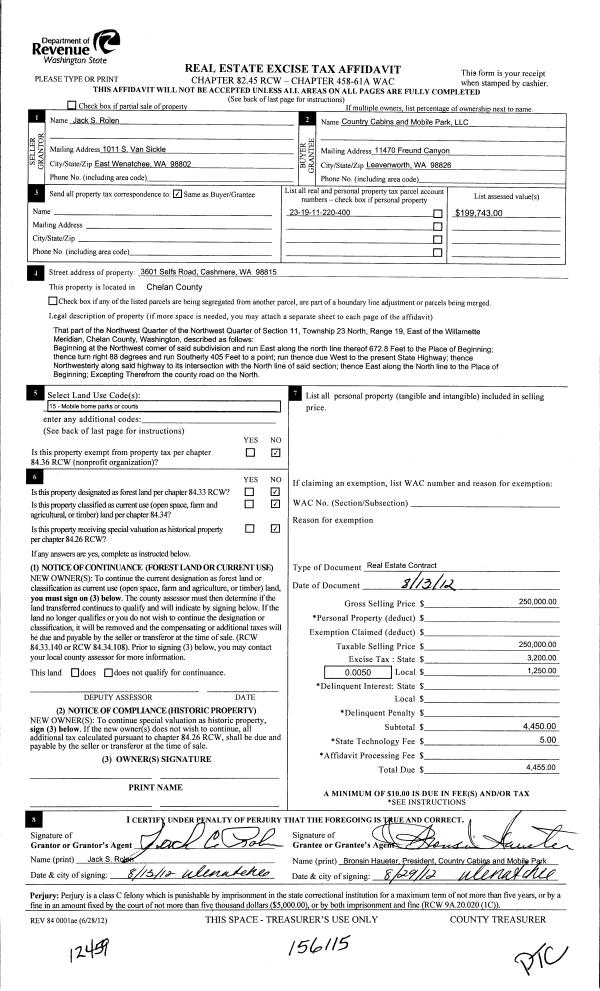 | 4 | 08/31/2012 | C | Real Estate Contract | ROLEN JACK C | COUNTRY CABINS AND MOBILE PARK LLC | | | $250,000.00 | 156115 | 2367302 |