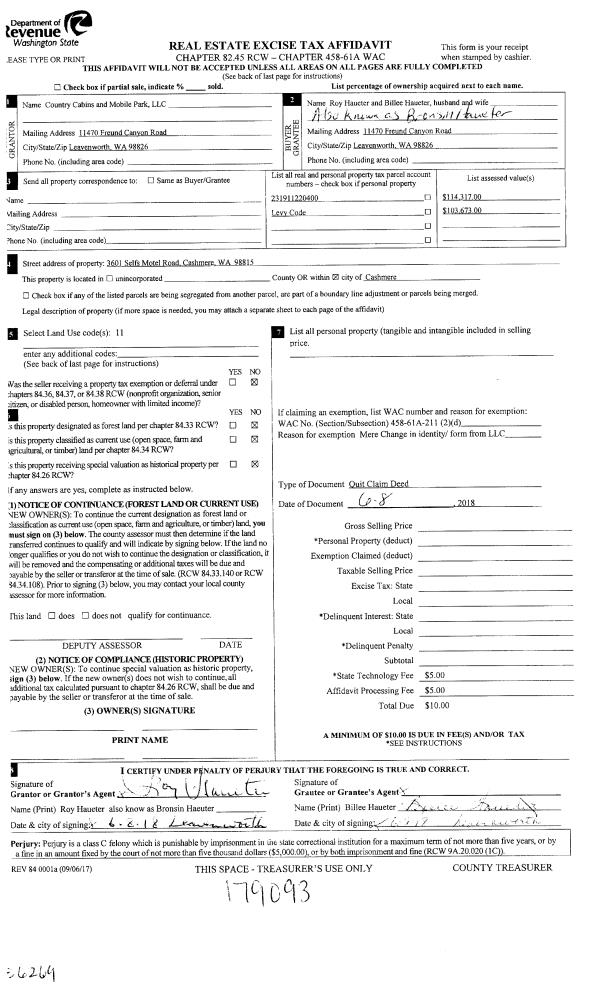 | 2 | 06/08/2018 | Q | Quit Claim Deed | COUNTRY CABINS AND MOBILE PARK LLC | HAUETER ROY & BILLEE | | | | 0 | 2479274 |
