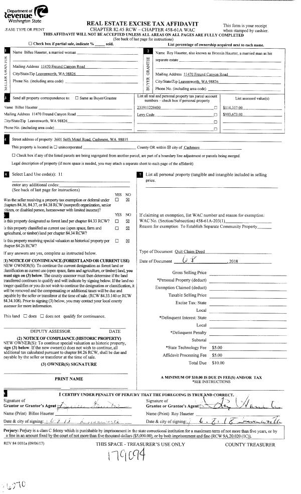 | 1 | 06/08/2018 | Q | Quit Claim Deed | HAUETER BILLEE | HAUETER ROY | | | | 0 | 2479275 |
