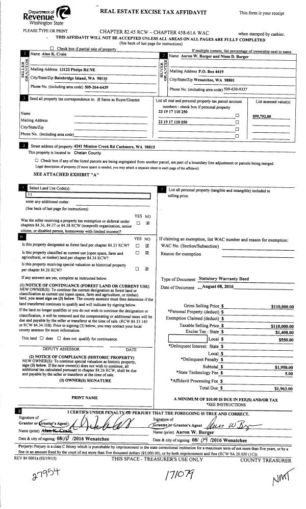 1 | 08/11/2016 | SWD | Statutory Warranty Deed | CRAIN ALAN K | BURGER AARON W & NISSA D | | | $110,000.00 | 171079 | 2441990 |