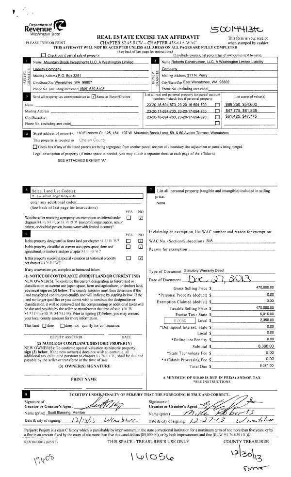 3 | 12/30/2013 | SWD | Statutory Warranty Deed | MOUNTAIN BROOK INVESTMENTS | ROBERTS CONSTRUCTION LLC | | | $470,000.00 | 161056 | 2394875 |