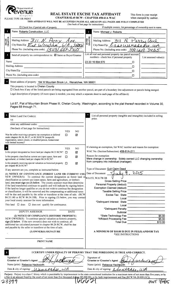 2 | 07/14/2015 | Q | Quit Claim Deed | ROBERTS CONSTRUCTION LLC | ROBERTS MICHAEL J | | | $0.00 | 166621 | 2421470 |