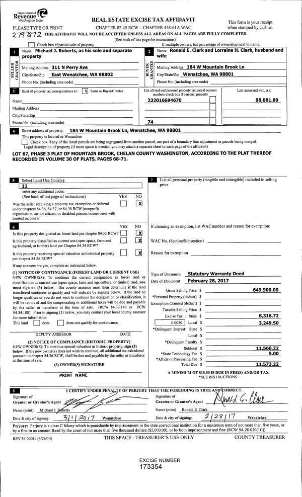 1 | 03/01/2017 | SWD | Statutory Warranty Deed | ROBERTS MICHAEL J | CLARK RONALD E & LORRAINE H | | | $649,900.00 | 173354 | 2453673 |