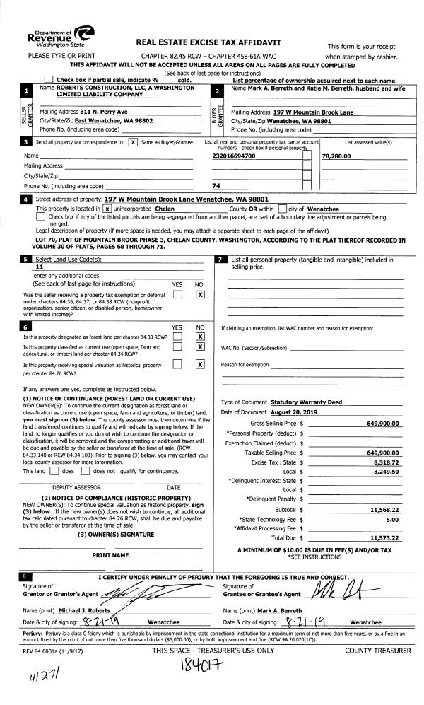 1 | 08/22/2019 | SWD | Statutory Warranty Deed | ROBERTS CONSTRUCTION LLC | BERRETH MARK A & KATIE M | | | $649,900.00 | 184017 | 2501220 |