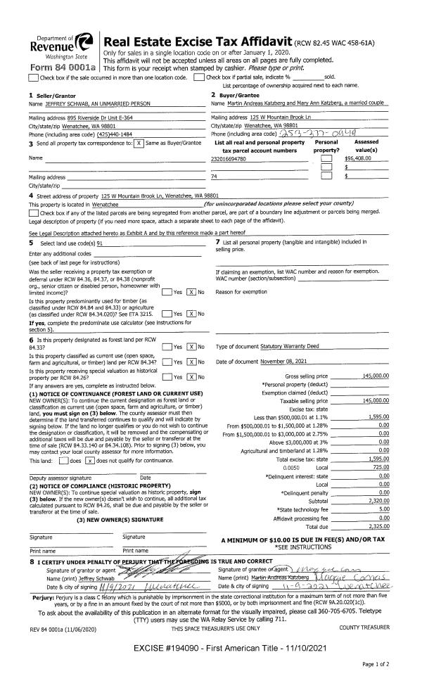 1 | 11/10/2021 | SWD | Statutory Warranty Deed | SCHWAB JEFFREY | KATZBERG MARTIN A & MARY A | | | $145,000.00 | 194090 | 2556667 |