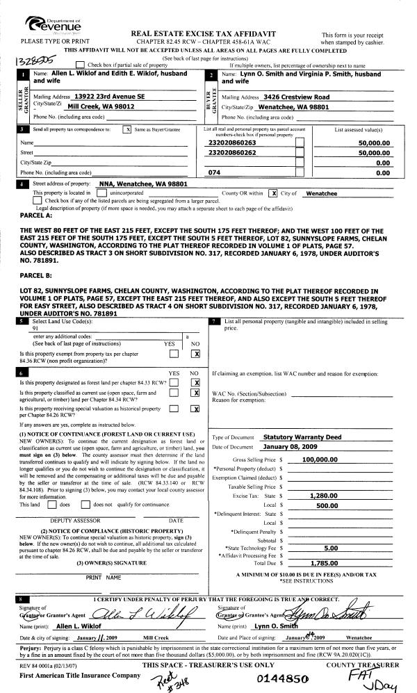 | 3 | 01/15/2009 | SWD | Statutory Warranty Deed | | SMITH LYNN O & VIRGINIA | | | $100,000.00 | 144850 | 2295834 |