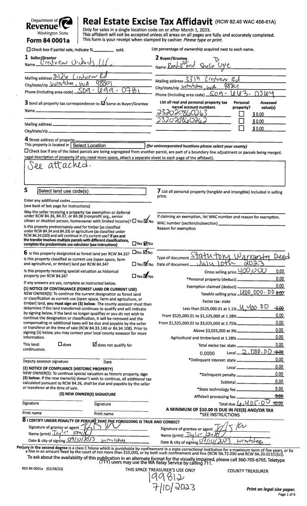| 1 | 07/10/2023 | SWD | Statutory Warranty Deed | CRESTVIEW ORCHARDS LLC | OGLE RANDALL W & SHELIA D | | | $400,000.00 | 199812 | 2583523 |