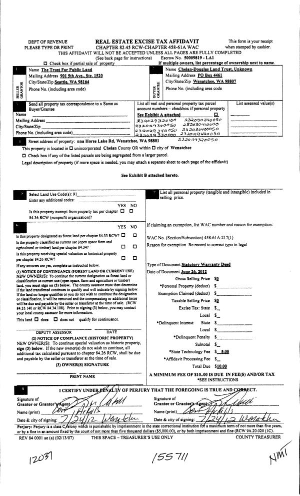 | 6 | 06/28/2012 | SWD | Statutory Warranty Deed | TRUST FOR PUBLIC LAND THE | CHELAN-DOUGLAS LAND TRUST - DO NOT USE-PLEASE USE 18007 | | | $1,000,000.00 | 155469 | **2363274 |