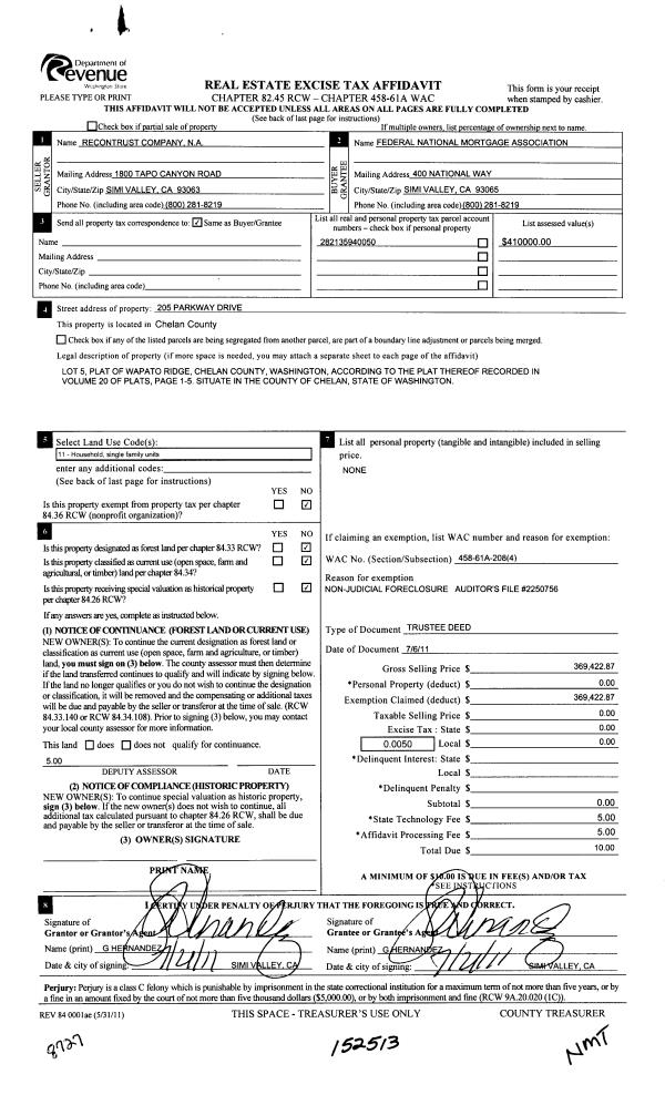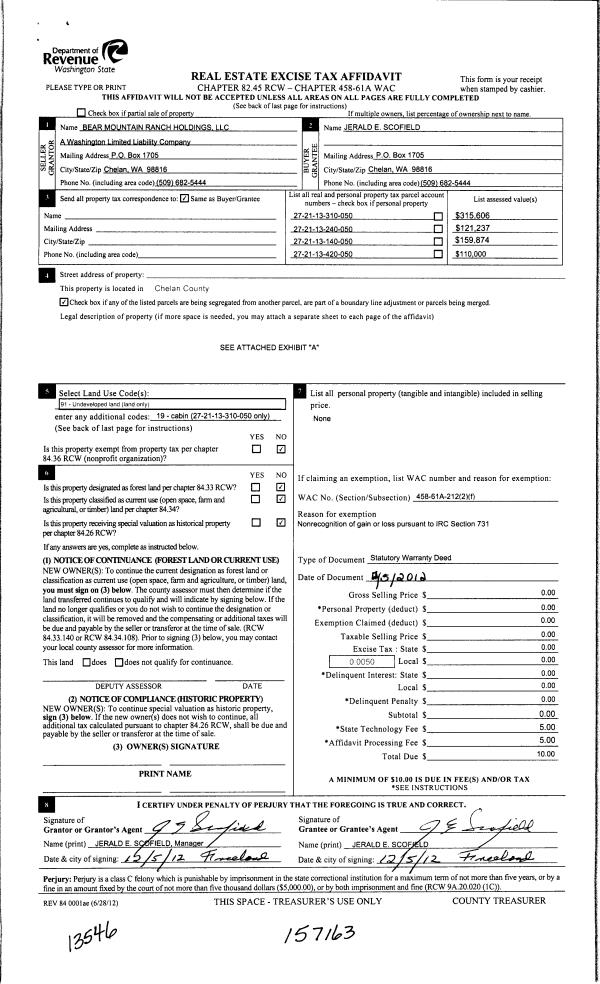 | 3 | 06/28/2012 | SWD | Statutory Warranty Deed | TRUST FOR PUBLIC LAND THE | CHELAN-DOUGLAS LAND TRUST - DO NOT USE-PLEASE USE 18007 | | | $1,000,000.00 | 155469 | **2363274 |