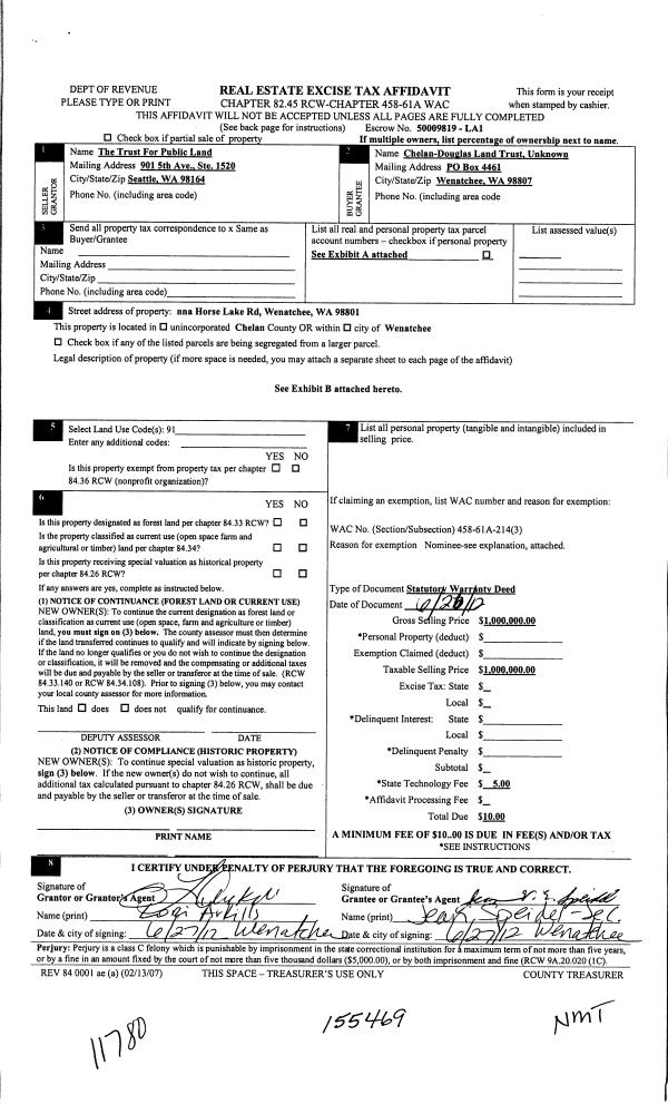 | 7 | 06/28/2012 | SWD | Statutory Warranty Deed | TRUST FOR PUBLIC LAND THE | CHELAN-DOUGLAS LAND TRUST - DO NOT USE-PLEASE USE 18007 | | | $1,000,000.00 | 155469 | **2363274 |