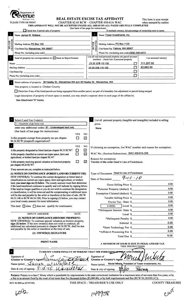 | 2 | 09/10/2010 | F | Foreclosure Deed | WALLACE JAMES W JR | TOWER INVESTMENTS INC | | | | 149958 | 2329405 |