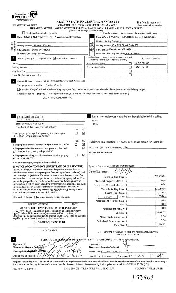 | 1 | 12/28/2011 | SWD | Statutory Warranty Deed | TOWER INVESTMENTS INC | WATER WORKS PROPERTIES LLC | | | $207,286.00 | 153909 | 2353925 |