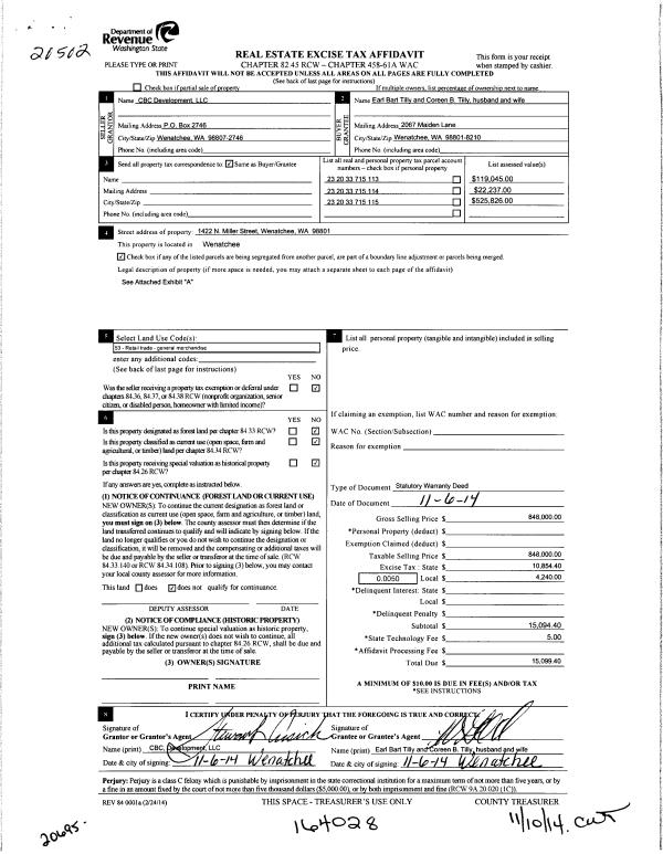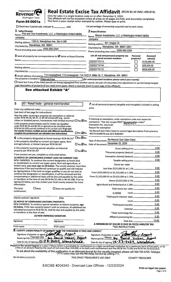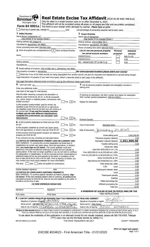 | 1 | 01/31/2025 | WD | Warranty Deed | RINCON INVESTMENTS LLC | CITY OF WENATCHEE | | | $0.00 | 204623 | 2603923 ROW |