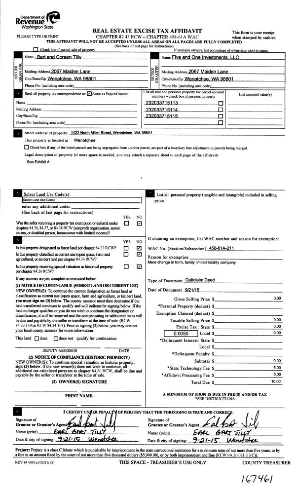 | 4 | 09/22/2015 | Q | Quit Claim Deed | TILLY E BART & COREEN B | FIVE AND ONE INVESTMENTS LLC | | | $0.00 | 167461 | 2425626 |