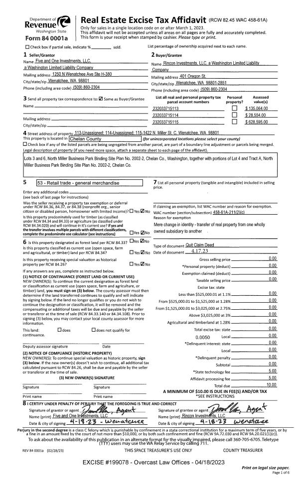 | 3 | 04/18/2023 | Q | Quit Claim Deed | FIVE AND ONE INVESTMENTS LLC | RINCON INVESTMENTS LLC | | | $0.00 | 199078 | 2580467 |