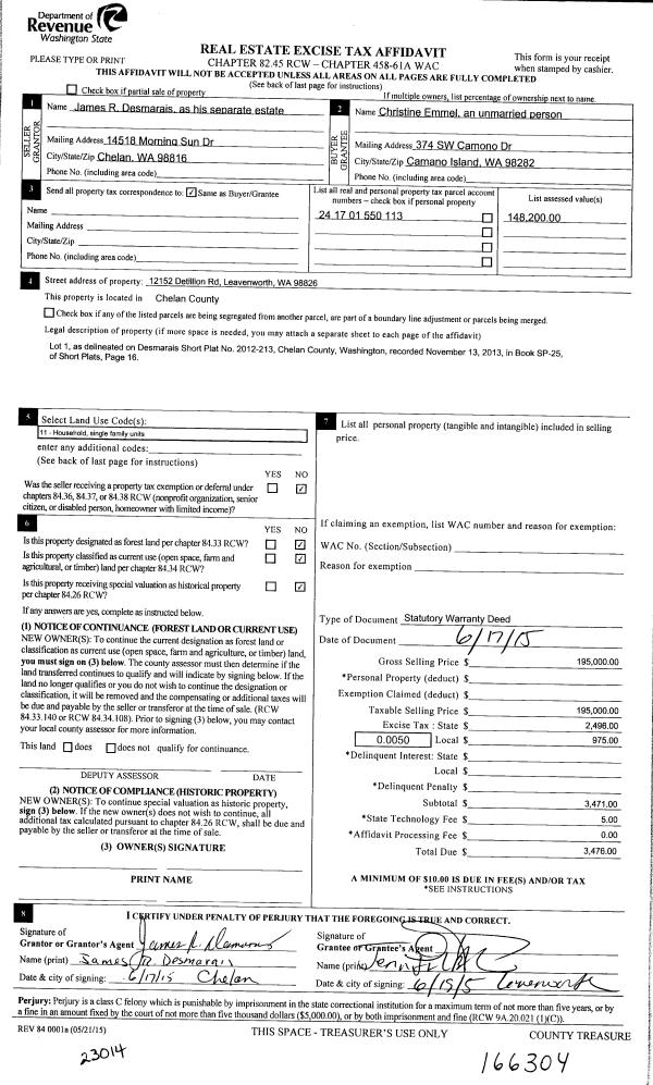 | 2 | 06/23/2015 | SWD | Statutory Warranty Deed | DESMARAIS JAMES R | EMMEL CHRISTINE | | | $195,000.00 | 166304 | 2420184 |