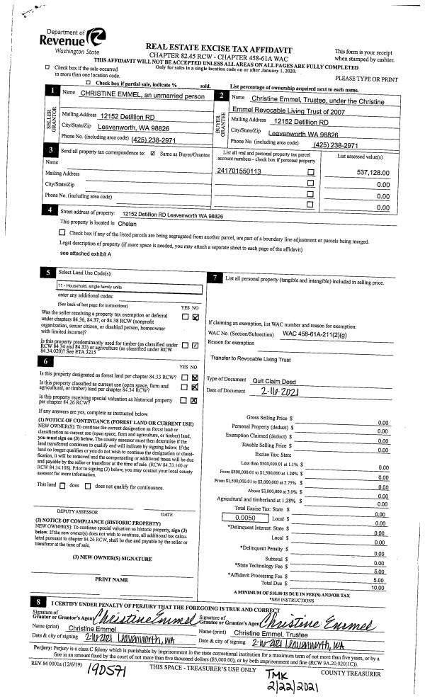 | Mailing Address: | EMMEL CHRISTINE TRUSTEE 12152 DETILLION RD LEAVENWORTH, WA 98826 | % Ownership: | % |