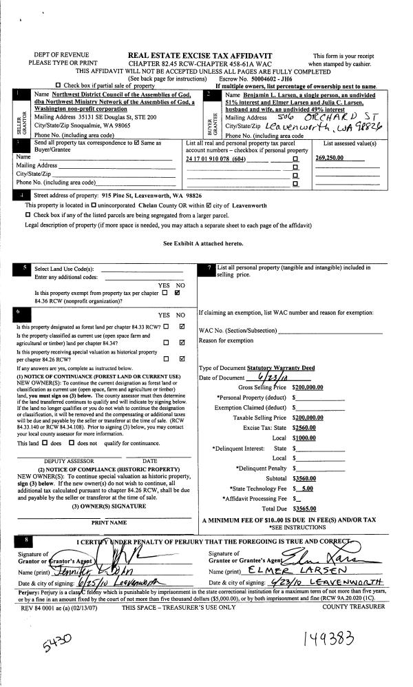 | 4 | 06/23/2010 | SWD | Statutory Warranty Deed | NW DISTRICT COUNCIL OF THE ASSEMBLIES OF GOD | LARSEN BENJAMIN L (S) & LARSEN ELMER & JULIE C H/W | | | $200,000.00 | 149383 | 2325793 |