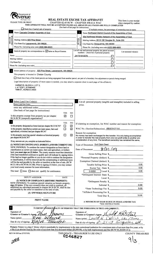 | 5 | 08/21/2009 | Q | Quit Claim Deed | CASCADE CHRISTIAN ASSEMBLY | NW DISTRICT COUNCIL OF THE ASSEMBLIES OF GOD | | | $0.00 | 146827 | 2310842 |