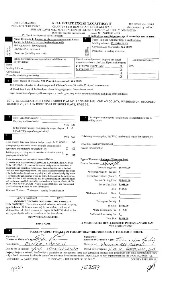 | 3 | 12/01/2011 | SWD | Statutory Warranty Deed | LARSEN BENJAMIN L (S) & LARSEN ELMER & JULIE C H/W | LUNZ GREG & SHARON | | | $180,000.00 | 153657 | 2352681 |