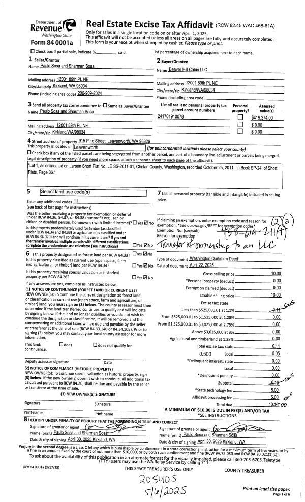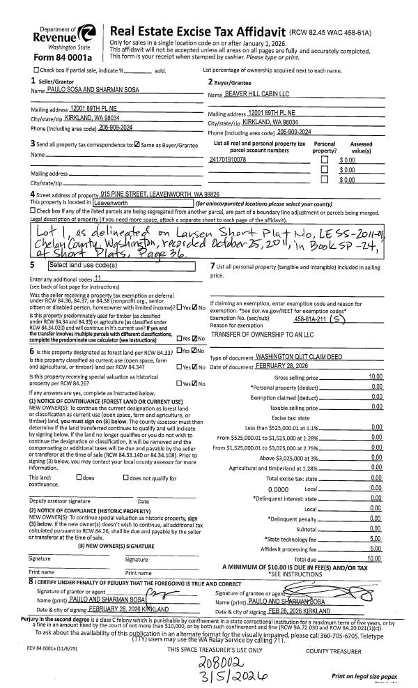 | 1 | 02/28/2026 | Q | Quit Claim Deed | SOSA PAULO G & SHARMAN M | BEAVER HILL CABIN LLC | | | $0.00 | 208002 | 2619195 |