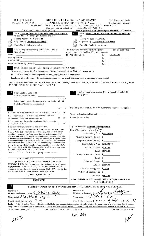 | 3 | 12/15/2014 | SWD | Statutory Warranty Deed | OGLE ELDRIDGE | LONG BRUCE & MARTHA LAMARCHE | | | $215,000.00 | 164361 | 2410686 |