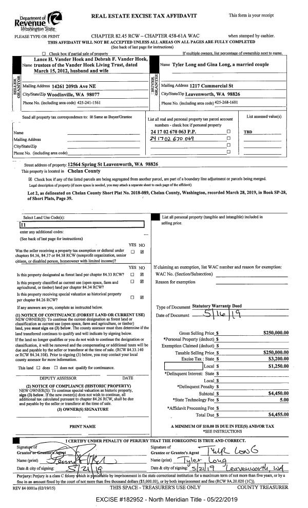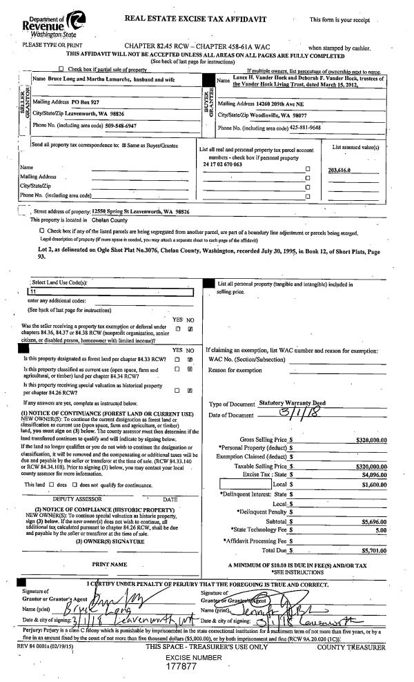 | 2 | 03/01/2018 | SWD | Statutory Warranty Deed | LONG BRUCE & MARTHA LAMARCHE | VANDER HOEK LIVING TRT | | | $320,000.00 | 177877 | 2473823 |