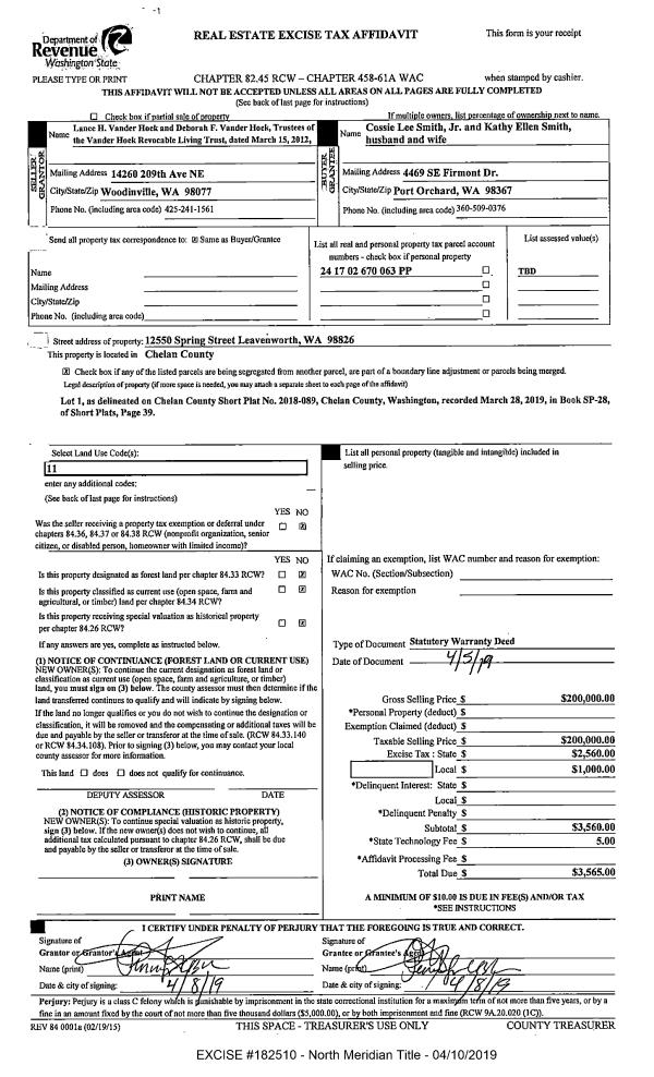 | 1 | 04/10/2019 | SWD | Statutory Warranty Deed | VANDER HOEK LIVING TRT | SMITH COSSIE L JR & KATHY E | | | $200,000.00 | 182510 | 2494316 |