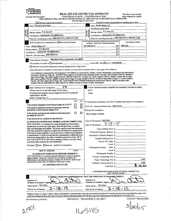 | 3 | 03/20/2015 | Q | Quit Claim Deed | ACTON DAN & LORNA | NORDIC VISTAS LLC | | | $0.00 | 165185 | 2415119 |
