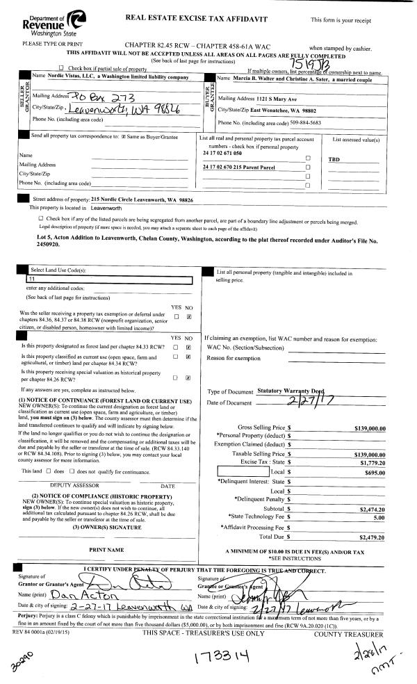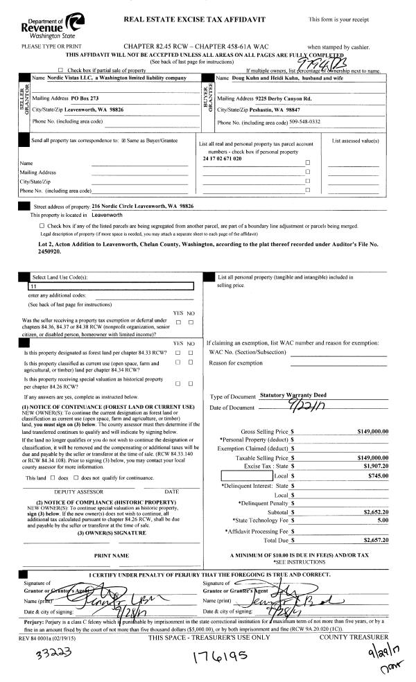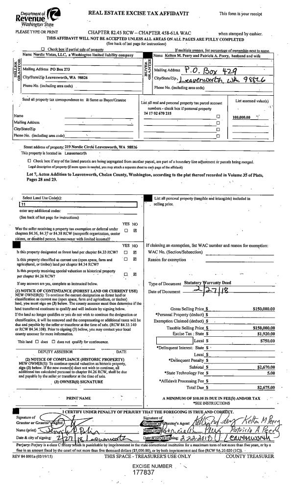 | 2 | 02/28/2018 | SWD | Statutory Warranty Deed | NORDIC VISTAS LLC | PEERY KELTON M & PATRICIA A | | | $150,000.00 | 177837 | 2473701 |