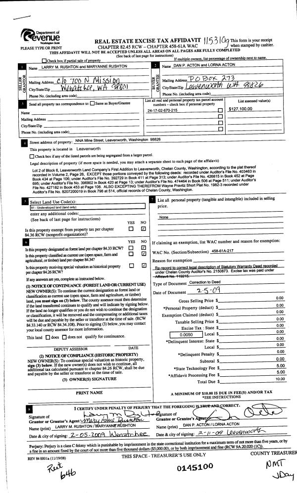 | 6 | 02/19/2009 | CORR DEED | Correction Deed | RUSHTON LARRY & MARYANNE | ACTON DAN & LORNA | | | | 145100 | 2297665 |