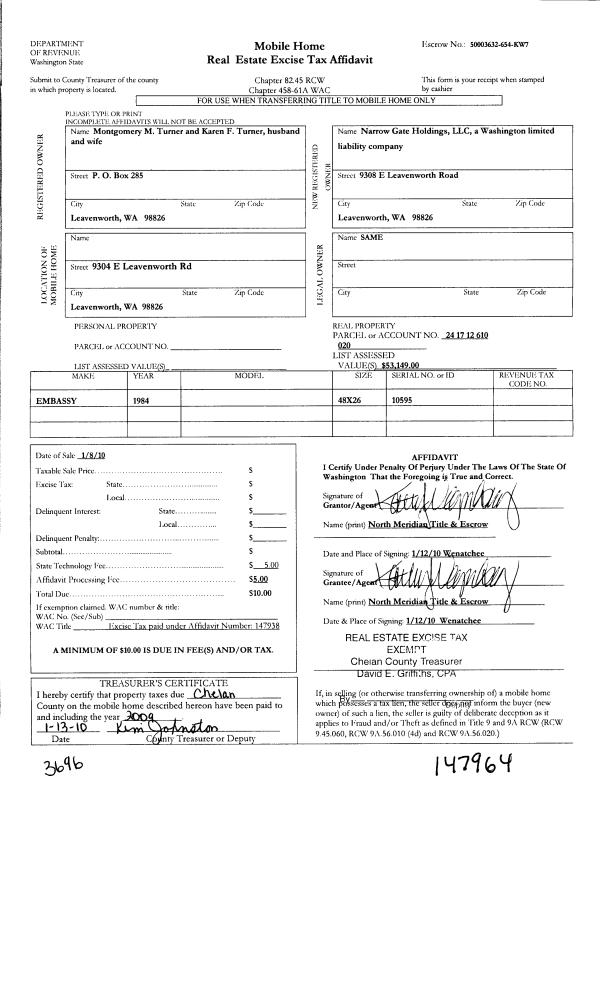 | 9 | 01/13/2010 | MH TITLE | Mobile Home Title | NARROW GATE HOLDINGS LLC | | | | | 0 | |