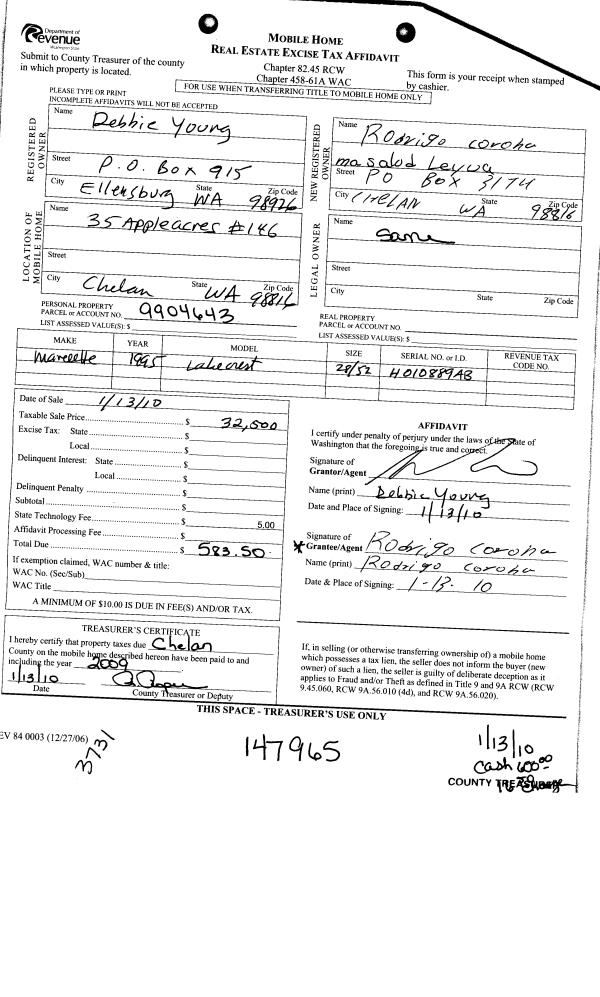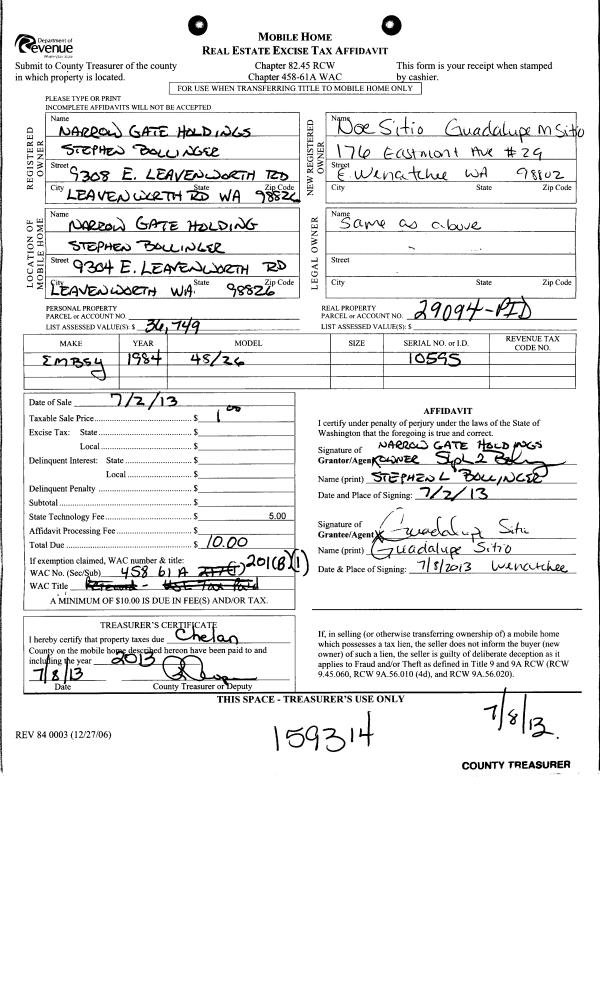 | 3 | 07/08/2013 | MH TITLE | Mobile Home Title | NARROW GATE HOLDINGS LLC | SITIO GUADALUPE MARISOL | | | | 159314 | |