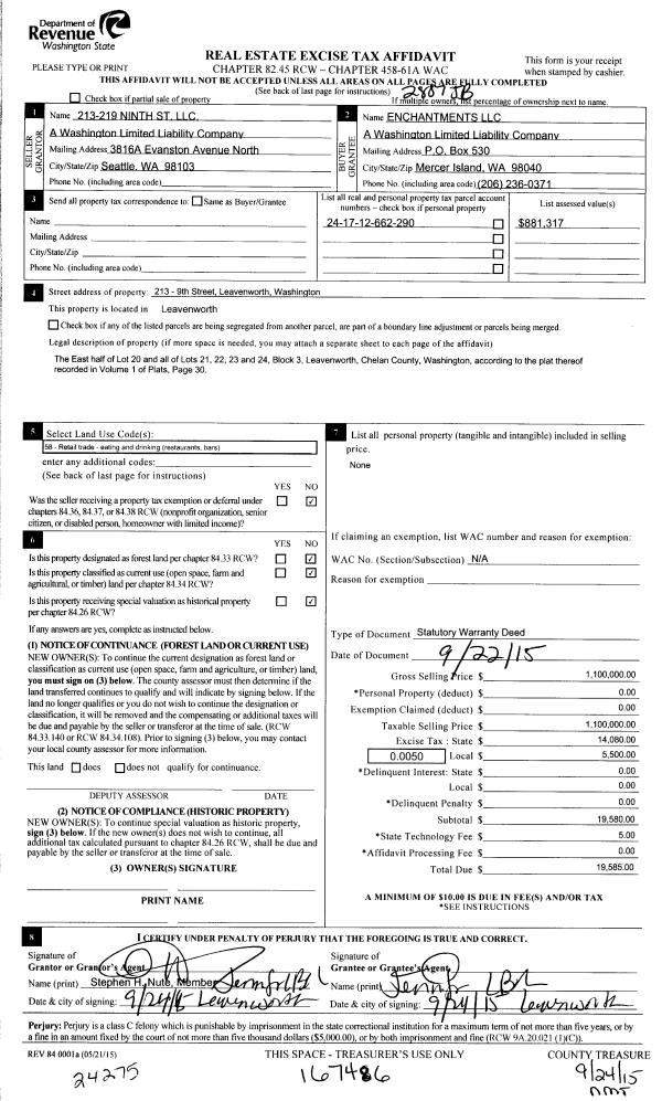 | 1 | 08/18/2021 | SWD | Statutory Warranty Deed | ENCHANTMENTS LLC | TUMWATER LEAVENWORTH LLC | | | $3,500,000.00 | 193033 | 2551030 |