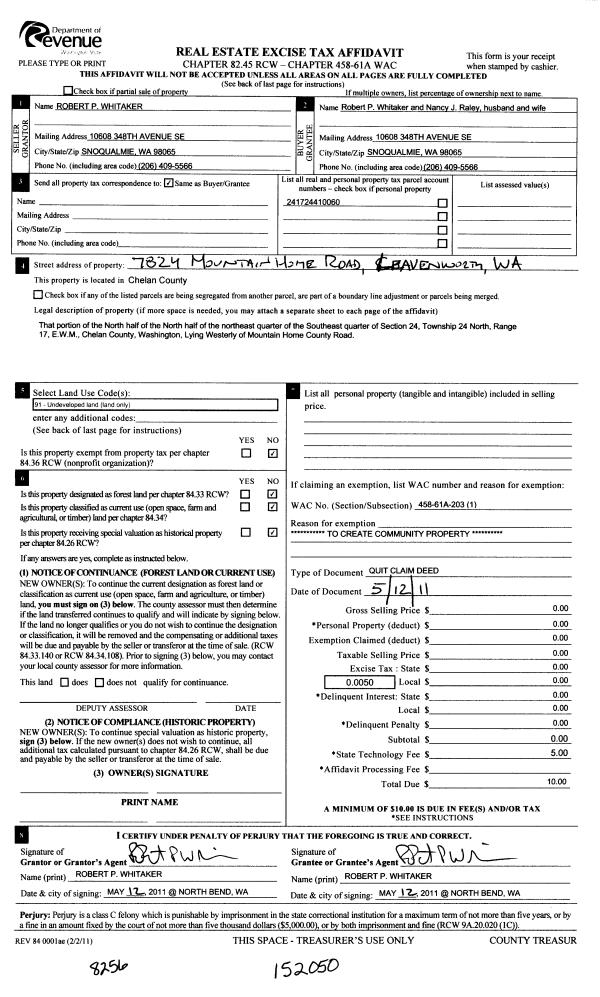 | 1 | 05/31/2011 | Q | Quit Claim Deed | WHITAKER ROBERT P | WHITAKER ROBERT P & NANCY J RALEY H/W | | | $0.00 | 152050 | 2343770 |
