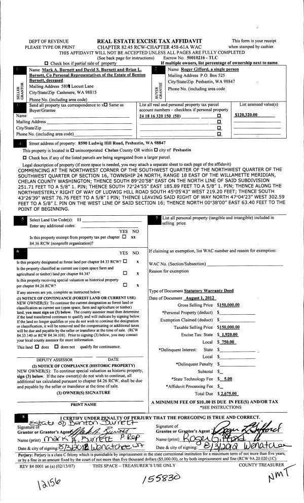 | 2 | 08/03/2012 | SWD | Statutory Warranty Deed | BURNETT BRIAN | GIFFORD ROGER | | | $150,000.00 | 155830 | 2365416 |