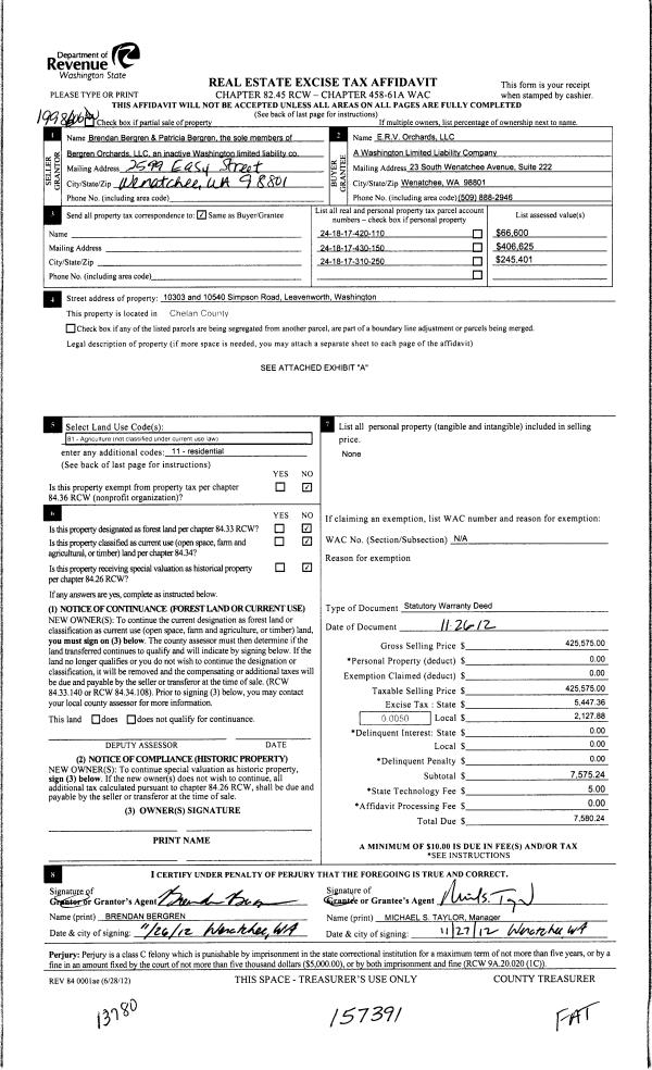 | 1 | 12/28/2012 | SWD | Statutory Warranty Deed | BERGREN ORCHARDS LLC | E R V ORCHARDS LLC | | | $425,575.00 | 157391 | 2374178 |