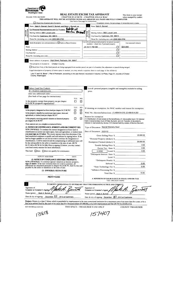 | 1 | 12/28/2012 | SP WD | Special Warranty Deed | BURNETT BRIAN | BURNETT MARK A | | | $0.00 | 157407 | 2374231 |