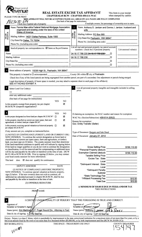 | 2 | 01/30/2012 | BARGAIN | Bargain & Sale Deed | FEDERAL NATIONAL MORTGAGE ASSOCIATION | JANTZER ANTHONY D & DONNA J | | | $156,110.00 | 154147 | 2355462 |