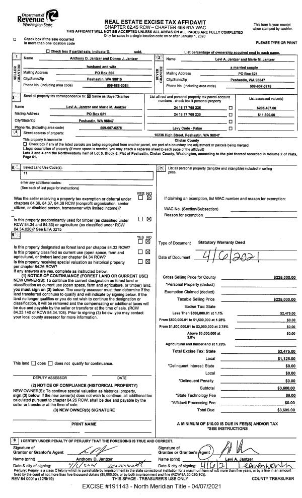 | 1 | 04/07/2021 | SWD | Statutory Warranty Deed | JANTZER ANTHONY D & DONNA J | JANTZER LEVI A & MARIE M | | | $225,000.00 | 191143 | 2540958 |