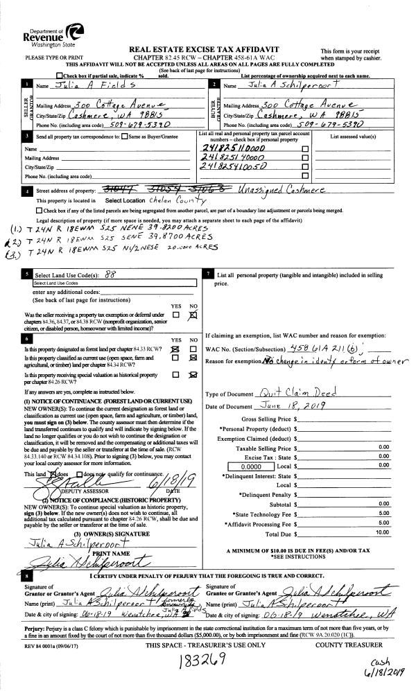 | 2 | 06/18/2019 | Q | Quit Claim Deed | FIELDS JULIA A | SCHILPEROORT JULIA A | | | $0.00 | 183269 | 2497689 |