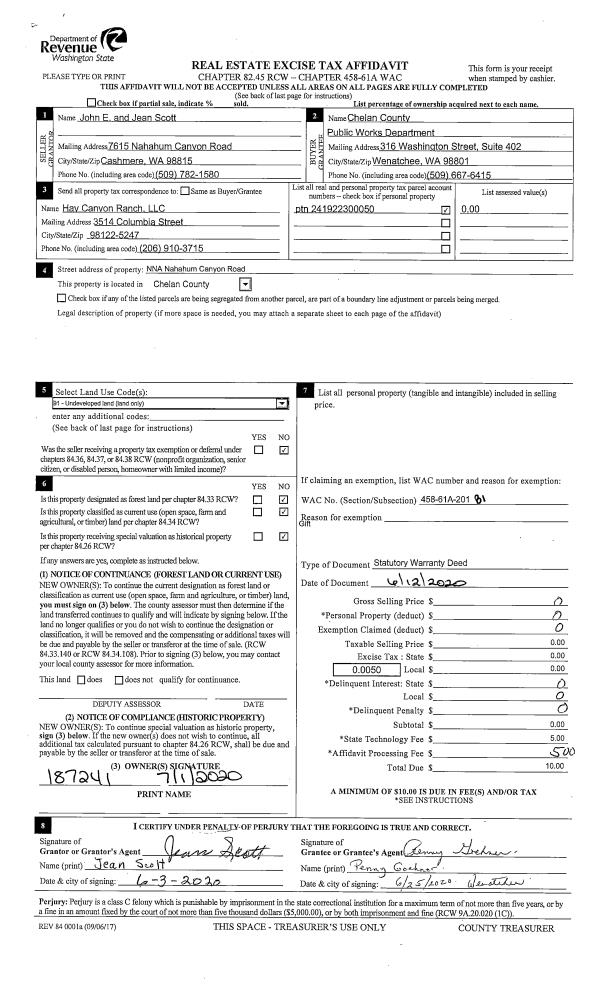 | 5 | 05/19/2020 | SWD | Statutory Warranty Deed | HAY CANYON RANCH LLC | CHELAN COUNTY PUBLIC WORKS | | | $0.00 | 186687 | 2515937* |